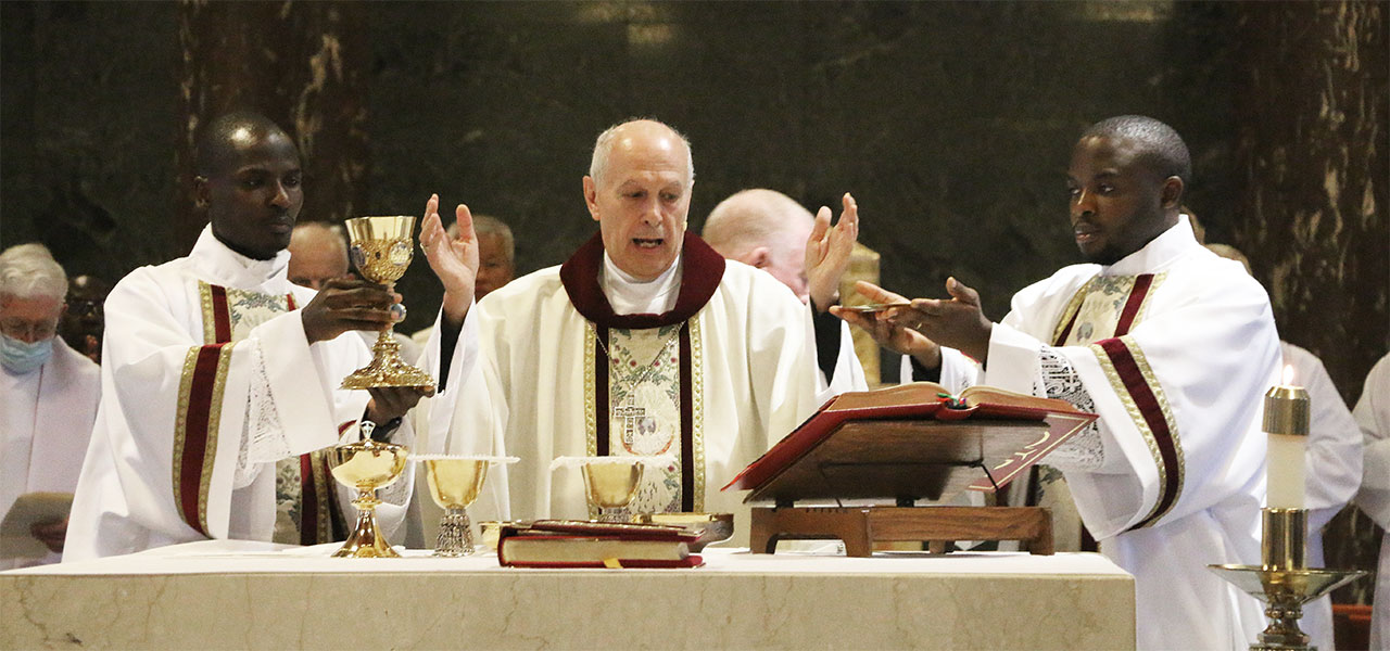 Featured image: Archbishop Gabriele Giordano Caccia (center) celebrates Mass during the ordination to the diaconate of Charles Ogony (left) and Joshua Maondo (right) on October 21, 2023. The seminarians will be ordained Maryknoll priests on June 8, 2024. (Diane Mastrogiulio/U.S.)