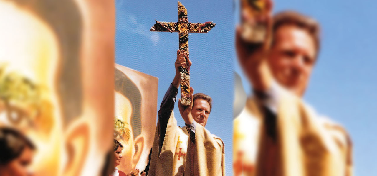 Featured image: At a Maryknoll gathering in Chile, Maryknoll Father Stephen Judd holds up the “cross of life.” Studded with locally produced seeds, grains and fruits, it symbolizes God’s love for creation. (Paul Sykora/Maryknoll Mission Archives/Chile)