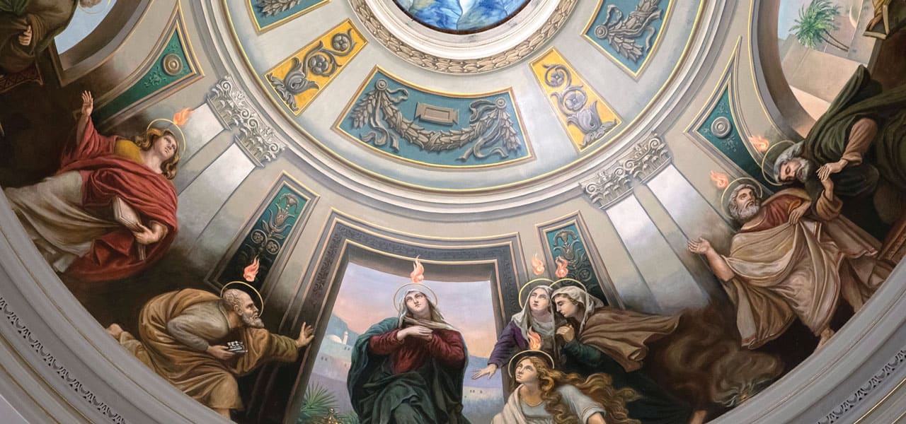 Imagen destacada:Una pintura en el techo de la iglesia St. Catherine en Spring Lake, New Jersey, representa el descenso del Espíritu Santo sobre los apóstoles. (Octavio Durán, OFM/EE. UU.)