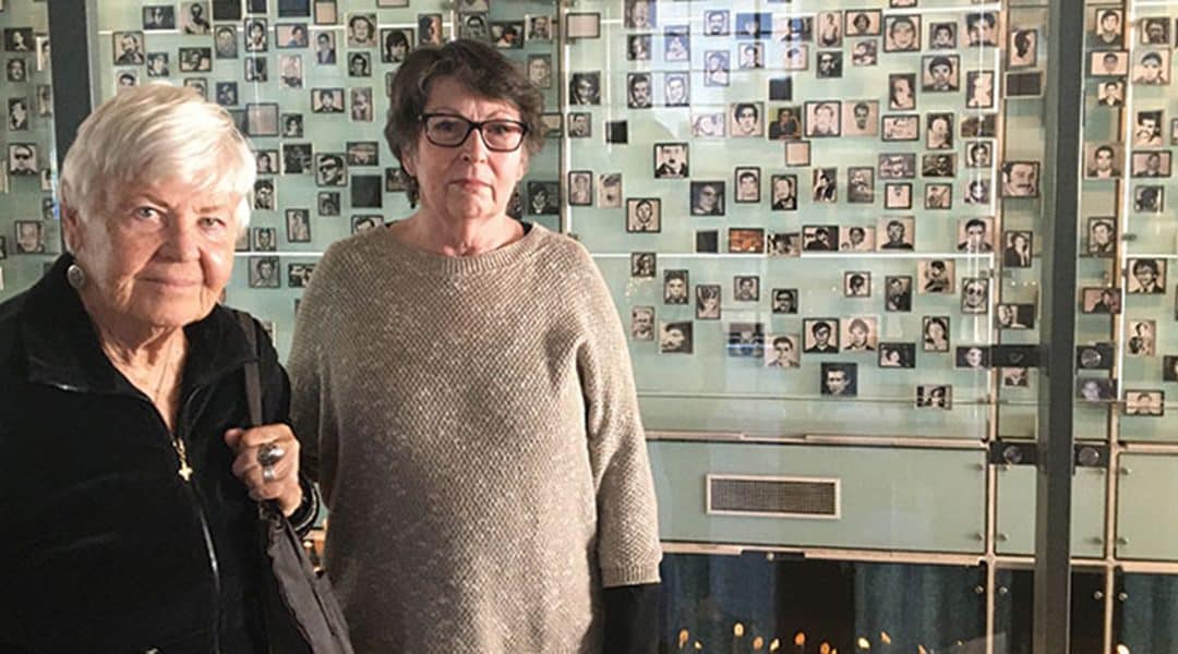 Un hombre y dos mujeres sostienen cuatro grandes fotos enmarcadas en blanco y negro de rostros de personas.