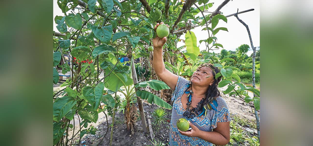 Imagen destacada: Anacelia Barros da Costa recoge frutas de un huerto urbano que ella y sus vecinos han plantado en el barrio de “Naciones Indígenas” en Manaos, Brasil. El barrio es hogar de miembros de más de una docena de grupos indígenas, muchos de los miembros han migrado a la ciudad en los últimos años y dejado sus hogares en la selva amazónica. (CNS/Paul Jeffrey)