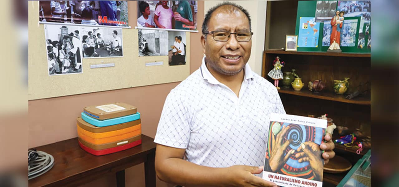 Imagen destacada: Sandro Paiva enseña su libro Un naturalismo andino acerca de la sabiduría indígena de los Andes en el museo Maryknoll en Cochabamba, Bolivia, donde sirve como voluntario. (Adam Mitchell/Bolivia)